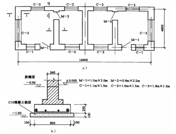 某小型住宅平面图和基础剖面图 a)平面图 b)剖面图