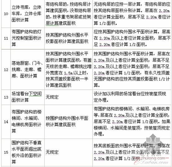 1.本规范规定建筑面积的计算是以外墙结构边线计算,勒脚仅是墙根部很矮的一部分墙体加厚,不能代表整个外墙结构,所以建筑物的面积以勒脚以上外墙结构外围面积计算。原面积计算规则规定单层建筑物,不论其高度如何均按一层计算。在当时情况下多指大的工业厂房。随着我国市场经济的发展,基本建设投资的多元化,产业结构的集约化,大型的养殖场、孵化场等不再是高大的建筑,而是适用的低矮的坡屋顶单层建筑,住宅小区也出现了高度不足2.20m的平屋顶单层停车库房。为此,我们将单层建筑分为平屋顶和坡屋顶两类,并按不同的高度和室内净高确定其面积的计算。