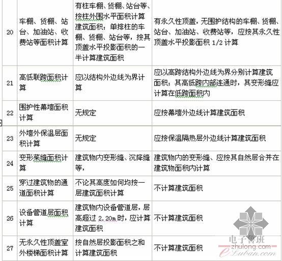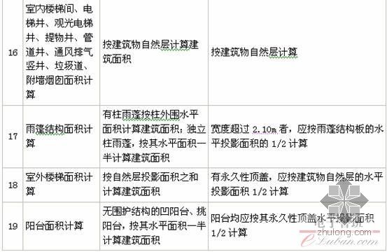 18.雨篷均以其宽度超过2.10m或不超过2.10m衡量,不超过者不计算面积,超过者按雨篷的结构板水平投影面积的1/2计算。有柱雨篷和无柱雨篷计算是一致的,解决了原面积计算规则对有一面墙体和独立柱支撑的雨篷无法计算面积的问题。