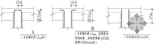 中柱顶层纵筋的锚固长度为弯锚(≦Lae):梁高-保护层+12d