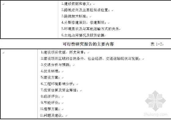 可行性研究按工作深度,划分为预可行性研究和工程可行性研究两个阶段。预可行性研究应重点阐明建设项目的必要性,通过踏勘和调查研究,提出建设项目的规模、技术标准,进行简要的经济效益分析。工程可行性研究应通过必要的测量、地质勘探(大桥、隧道及不良地质地段等),在认真调查研究,拥有必要资料的基础上,对不同建设方案在经济上、技术上进行综合论证,提出推荐建设方案,工程可行性研究报告经审批后作为初步设计的依据。工程可行性研究的投资估算与初步设计概算总额之差,应控制在10%以内。公路建设项目可行性研究报告的主要内容如表1-2所示。