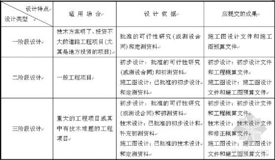 公路工程基本建设一般采用两阶段设计,即初步设计和施工图设计。对于技术简单、方案明确的小型建设项目,可采用一阶段设计,即一阶段施工图设计;技术复杂而又缺乏经验的建设项目或建设中个别路段、特殊大桥、互通式立体交叉、隧道等,必要时采用三阶段设计,即初步设计、技术设计和施工图设计。如何选择工程设计类型,具体如表1-3所示。