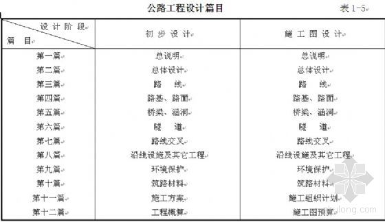 为了便于对设计工作进行管理(核定和审查等),避免设计文件内容的遗漏,提高工程设计质量,必须对设计文件的编制方法、编制内容、内容顺序以及格式做出严格的要求。表1-5是1996年交通部颁发的《公路工程基本建设项目设计文件编制办法》中提出的设计文件规范篇目。初步设计和施工图设计的篇目类似,但两者的设计深度要求不同。技术设计文件的篇目可参照该表进行。