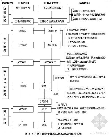 概算和基本建设规划执行情况;各项技术经济指标完成情况;各项拨款(或贷款)使用情况;建设成本和投资效果的分析以及建设过程中的主要经验;存在的问题和解决意见等。应当注意,施工单位往往也根据工程结算结果,编制单位工程竣工成本决算,核算单位工程的预算成本、实际成本和成本降低额。工程结算作为企业内部成本分析、反映经营效果、总结经验、提高经营管理水平的手段,它与建设项目的竣工决算在概念上是不同的。公路工程造价体系与基本建设程序关系如图1-2所示。