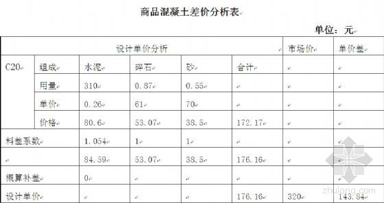 通常设计院做法有两种:一是将定额子目中水泥标号调整,同时单独进行商品砼的补差(52元/m3,不参与取费);二是提供混凝土差价分析表具体分析商品砼价差(不足之处:未考虑现场搅拌的人工、机械费用),如:
