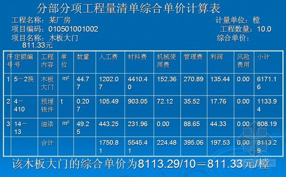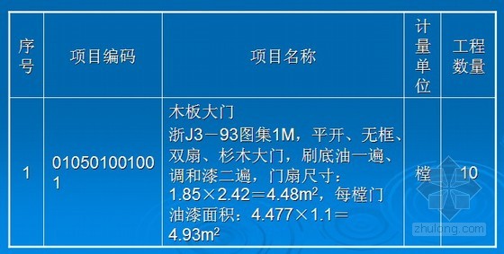 例:某厂房设计采用浙J3-93杉木大门1M1824,10樘,油一底二面调和漆。按清单计价规范编制工程量清单,并计算综合单价。