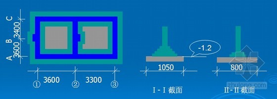 说明:1-3轴为1-1截面,A/C轴为2-2截面,基底垫层为C10砼,附墙砖垛凸出半砖,宽一砖半。
