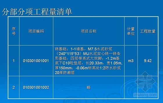 该工程砖基础有两种截面规格,应分别列项。工程数量计算: