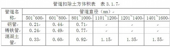 2.管道沟槽回填,以挖方体积减去管径所占体积计算。管径在500mm以下的不扣除管道所占体积;管径超过500mm以上时按表3.1.7规定扣除管道所占体积计算。