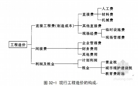 我国现行建筑工程造价构成就是根据上述理论进行构思的,也符合我国改革后的财会制度的指导思想和发展趋势。建筑工程造价的费用项目构成如图32-1所示。
