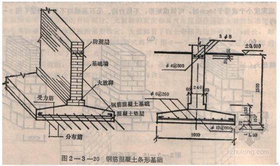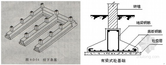 有梁式带形基础:带形基础截面呈形,且配有梁的钢筋时为有梁式带形基础,但梁(肋)高宽比应不大于4。
