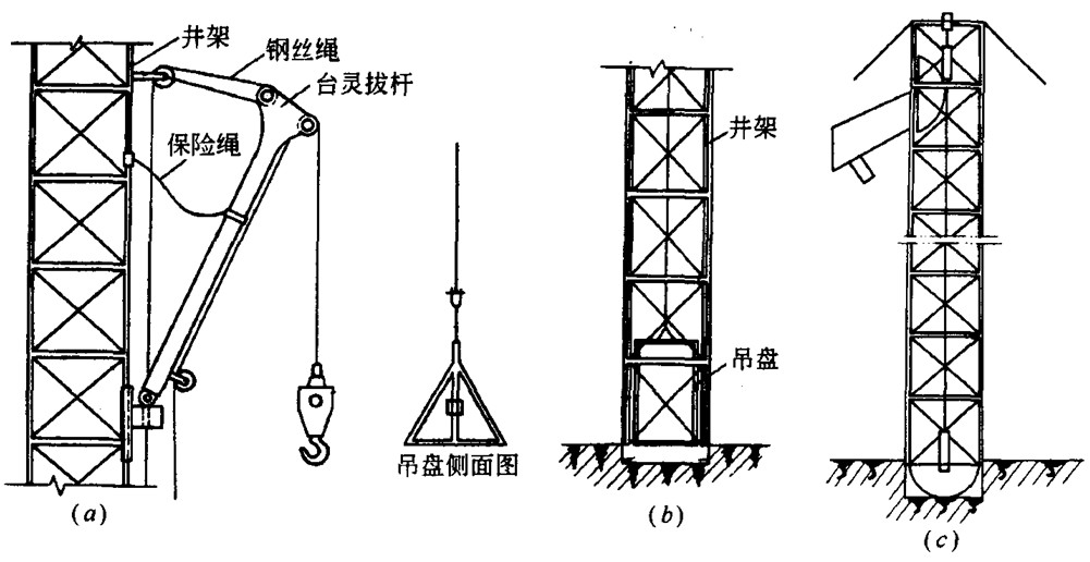 主要用于高层建筑混凝土灌筑时的垂直运输机械,由井架、台灵拔杆、卷扬机、吊盘、自动倾卸吊斗及钢丝缆风绳等组成,具有一机多用、构造简单、装拆方便等优点。起重高度一般为25~40m。见图10-19。