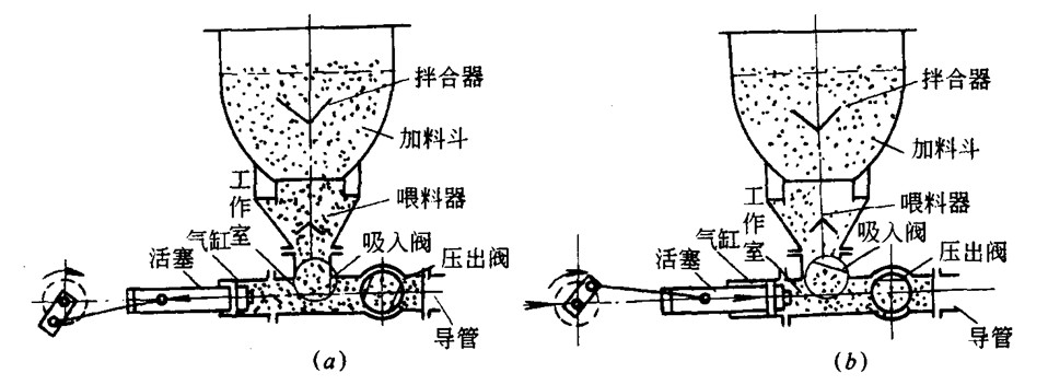 (1)机械式混凝土泵的工作原理,见图10-21,进入料斗的混凝土,经拌合器搅拌可避免分层。喂料器可帮助混凝土拌合料由料斗迅速通过吸入阀进入工作室。吸入时,活塞左移,吸入阀开,压出阀闭,混凝土吸入工作室;压出时,活塞右移,吸入阀闭,压出阀开,工作室内的混凝土拌合料受活塞挤出,进入导管。