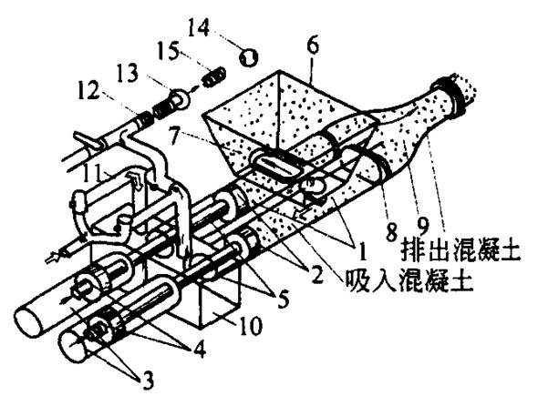 1-混凝土缸;2-推压混凝土的活塞;3-液压卸;4-液压活塞;5-活塞杆;