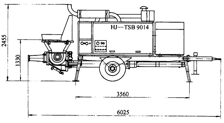 固定式混凝土泵使用时,需用汽车将它拖带至施工地点,然后进行混凝土输送。这种形式的混凝土泵主要由混凝土推送机构、分配闸机构、料斗搅拌装置、操作系统、清洗系统等组成。它具有输送能力大、输送高度高等特点,一般最大水平输送距离为250~600m,最大垂直输送高度为150m,输送能力为60m3/h左右,适用于高层建筑的混凝土输送。见图10-24。混凝土固定泵技术性能见表10-58。