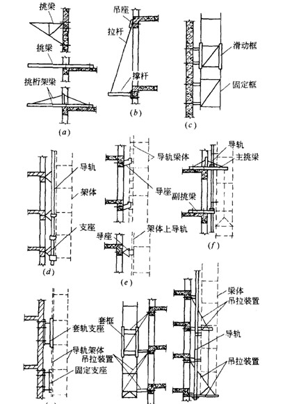 (a)悬挑式;(b)吊拉式;(c)套框式;(d)导轨式;(e)导座式;