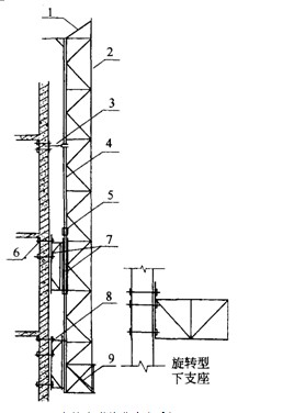 附着支承即将脚手架附着于工程边侧结构(墙体、框架)之侧并支承和传递脚手架荷载的附着构造,共有图5-108所示9种,由于悬挑式和吊拉式无防倾构造,现已停止使用,故按附着支承方式可划分成以下7种: