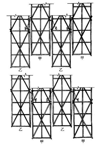 3)互爬升降的附着升降脚手架。即相邻架体互为支托并交替提升(或落下)的附着升降脚手架。
