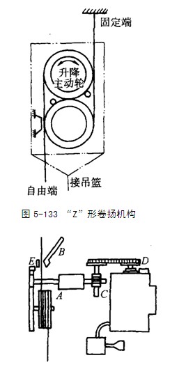 由不同的钢丝绳缠绕方式形成了Z形卷扬机构(图5-133)、3形卷扬机构(图5-134)和形卷扬机构(图5-135)。Z形机构为一对靠齿轮啮合的槽轮,靠摩擦带动其槽中的钢丝绳一起旋转,并依旋转方向的改变实现提升或下降;3形机构只有1个轮子,钢丝绳在卷筒上缠绕4圈后从两端伸出,分别接至吊篮和排挂支架上;形机构采用行星齿轮机构驱动卷筒旋转,带动吊篮沿钢丝绳升降。