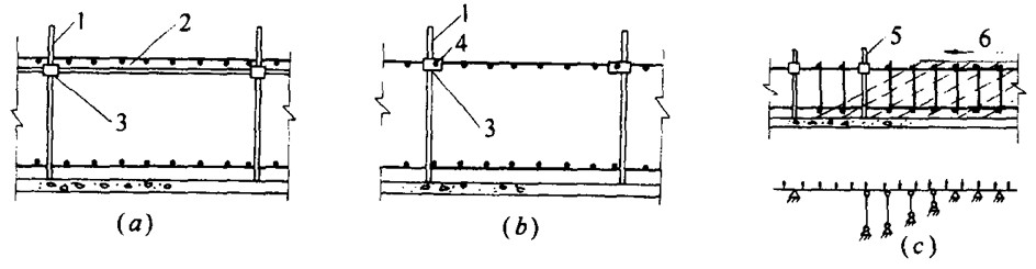 6.对厚片筏上部钢筋网片,可采用钢管临时支撑体系。图9-117(a)示出绑扎上部钢筋网片用的钢管支撑。在上部钢筋网片绑扎完毕后,需置换出水平钢管;为此另取一些垂直钢管通过直角扣件与上部钢筋网片的下层钢筋连接起来(该处需另用短钢筋段加强),替换了原支撑体系,见图9-117(b)。在混凝土浇筑过程中,逐步抽出垂直钢管,见图9-117(c)。此时,上部荷载可由附近的钢管及上、下端均与钢筋网焊接的多个拉结筋来承受。由于混凝土不断浇筑与凝固,拉结筋细长比减少,提高了承载力。