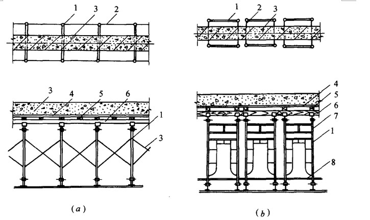 1-门架;2-交叉支撑;3-梁;4-模板;5-小楞;6-托梁;7-调节梁;8-水平加固杆