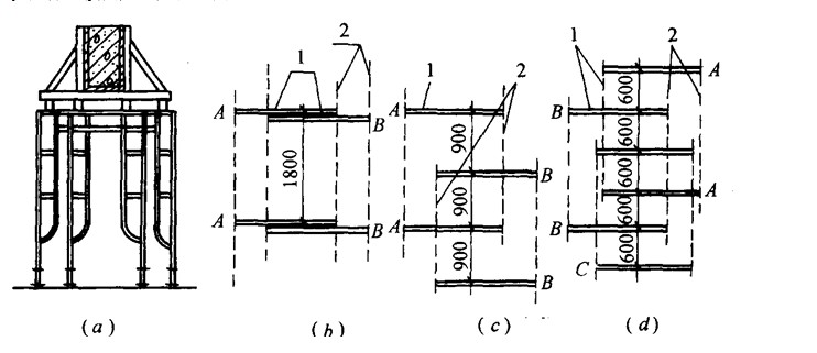 2)门架平行于梁轴线的两排布置。排距根据需要确定,一般为0.8~1.2m,排间装以适合的交叉支撑或以横杆连接固定,同排门架间用大横杆连接固定(图5-106b)。