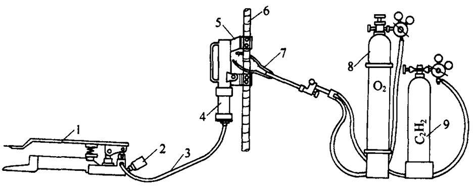 6-被焊接钢筋;7-多火口烤枪;8-氧气瓶;9-乙炔瓶
