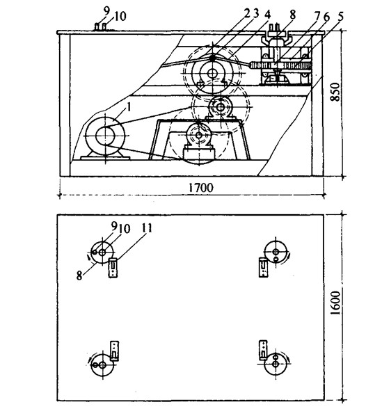 四头弯筋机(图9-72)是由一台电动机通过三级变速带动圆盘,再通过圆盘上的偏心铰带动连杆与齿条,使四个工作盘转动。每个工作盘上装有心轴与成型轴,但与钢筋弯曲机不同的是:工作盘不停地往复运动,且转动角度一定(事先可调整)。