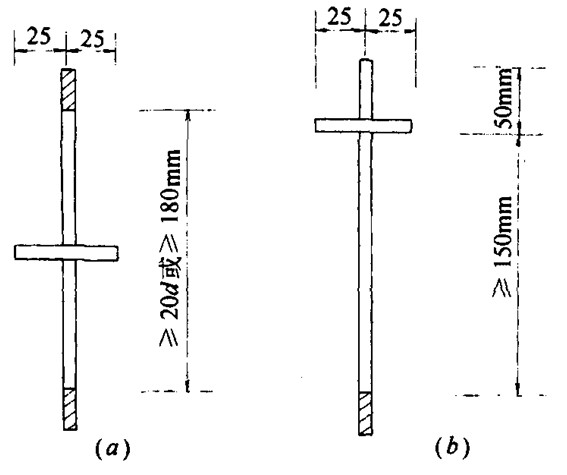 钢筋焊接网的焊点应作力学性能试验。在每批焊接网中,应随机抽取一张网片,在纵、横向钢筋上各截取2根试件,分别进行拉伸和冷弯试验;并在同一根非受拉钢筋上随机截取3个抗剪试件。试件的尺寸见图9-84所示。