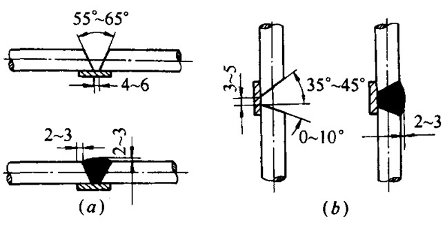(2)钢筋坡口平焊时,V形坡口角度宜为55~65(图9-88a);坡口立焊时,坡口角度宜为40~55,其中下钢筋为0~10,上钢筋为35~45(图9-88b);