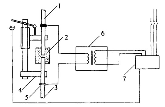 1-上钢筋;2-焊剂盒;3-下钢筋;4-焊接机头;5-焊钳;6-焊接电源;7-控制箱