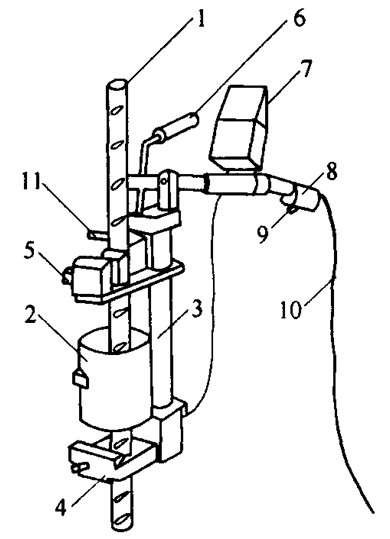 1-钢筋;2-焊剂盒;3-单导柱;4-固定夹头;5-活动夹头;6-手柄;