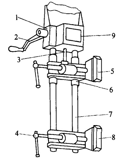 5-上夹头;6-导管;7-双导柱;8-下夹头;9-操作盒