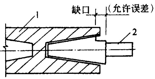4.锥螺纹套筒的验收,应检查:套筒的规格、型号与标记;套筒的内螺纹圈数、螺距与齿高;螺纹有无破损、歪斜、不全、锈蚀等现象。其中套筒检验的重要一环是用锥辊纹塞规检查同规格套筒的加工质量,见图9-103。当套筒大端边缘在锥螺纹塞规大端缺口范围内时,套筒为合格品。