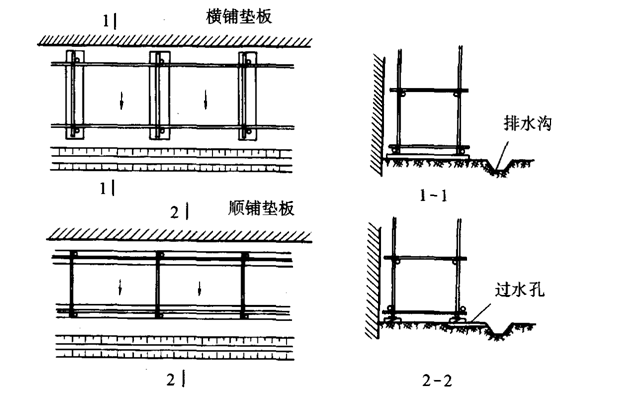 1)30m以下的脚手架、其内立杆大多处在基坑回填土之上。回填土必须严格分层夯实。垫木宜采用长2.0~2.5m、宽不小于200mm、厚50~60mm的木板,垂直于墙面放置(用长4.0m左右平行于墙放置亦可),在脚手架外侧挖一浅排水沟排除雨水,如图所示。