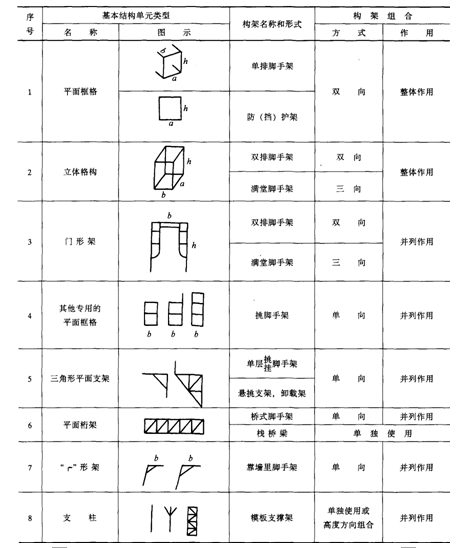 脚手架构架的基本结构为直接承受和传递脚手架垂直荷载作用的构架部分。在多数情况下,构架基本结构由基本结构单元组合而成。