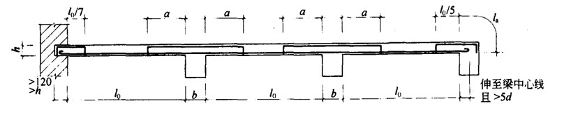 当多跨单向板、多跨双向板采用分离式配筋时,跨中正弯矩钢筋宜全部伸人支座;支座负弯矩钢筋向跨内的延伸长度a应覆盖负弯矩图并满足钢筋锚固的要求(图9-9)。