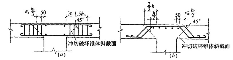 箍筋应配置在柱边以外不小于1.5h0范围内,其间距不应大于h0/3(图9-13a)箍筋外形宜为封闭式。箍筋直径不应小于6mm。