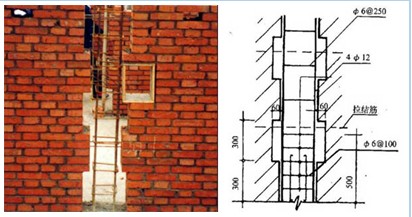 在骨架承重体系的建筑中,柱子上面每500mm高左右留出拉结钢筋,以便在砌筑填充墙时将拉结钢筋砌入墙体的水平灰缝内。拉结筋不少于26,深入墙内距离一、二级框架沿全长设置;三、四级框架不小于1/5墙长,并不小于700mm。