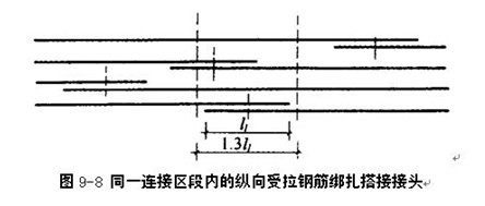 (1)钢筋绑扎搭接接头连接区段的长度为1.3l1(l1为搭接长度),凡搭接接头中点位于该连接区段长度内的搭接接头均属于同一连接区段(图9-8)。同一连接区段内,纵向受拉钢筋搭接接头面积百分率应符合设计要求;当设计无具体要求时,应符合下列规定: