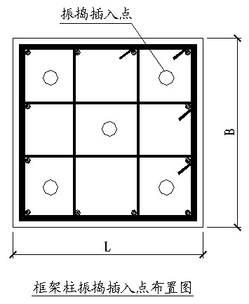 ①柱浇筑前在底部先铺垫与混凝土配合比相同减石子砂浆,并使底部砂浆厚度为40mm。柱砼分层浇筑,每层浇筑柱砼的厚度为40cm,振捣棒不得触动钢筋和预埋件,插入点均匀,防止多振或漏振(见图)。