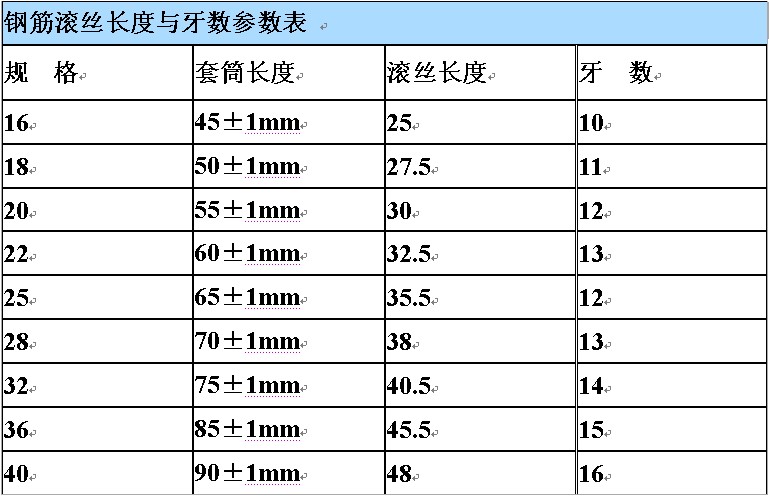 3)钢筋丝头长度应满足产品设计要求,具体长度及牙数如下表所示。