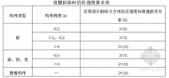 1.非承重模板(墙、柱、梁侧模)拆除时,结构混凝土强度宜不低于1.2Mpa,以能保证砼表面及棱角不受损坏,承重模板(底模)的拆模时间应符合设计要求,当无具体要求时,砼强度应符合下表规定。
