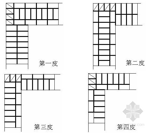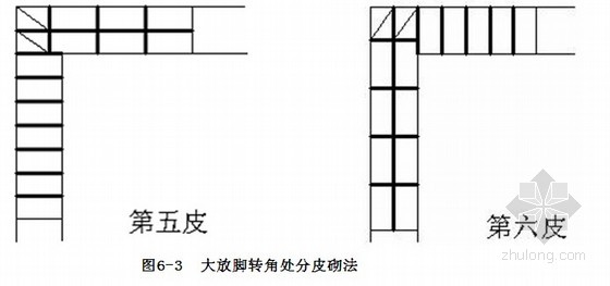 等高式大放脚是两皮一收,两边各收进1/4砖长;不等高大放脚是两皮一收和一皮一收相间隔,两边各收进1/4砖长。大放脚一般采用一顺一丁砌法,上下皮垂直灰缝相互错开60。砖基础的转角处、交接处,为错缝需要应加砌配砖(3/4砖、半砖或1/4砖)。在这些交接处,纵横墙要隔皮砌通;大放脚的最下一皮及每层的最上一皮应以丁砌为主。底宽为2砖半等高式砖基础大防角转交处分皮砌法如图6-3所示。