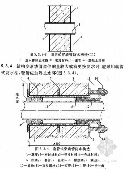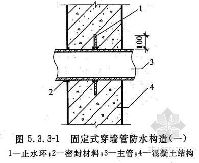 5.3.3结构变形或管道伸缩量较小时,穿墙管可采用主管直接埋入混凝土内的固定式防水法,主管应加焊止水环或环绕遇水膨胀止水圈,并应在迎水面预留凹槽,槽内应采用密封材料嵌填密实。其防水构造形式宜采用图5.3.31和5.3.32。