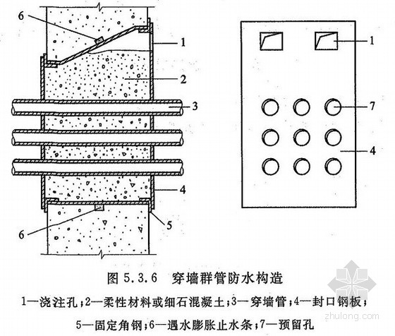 5.3.6穿墙管线较多时,宜相对集中,并应采用穿墙盒方法。穿墙盒的封口钢板应与墙上的预埋角钢焊严,并应从钢板上的预留浇注孔注入柔性密封材料或细石混凝土(图5.3.6)。