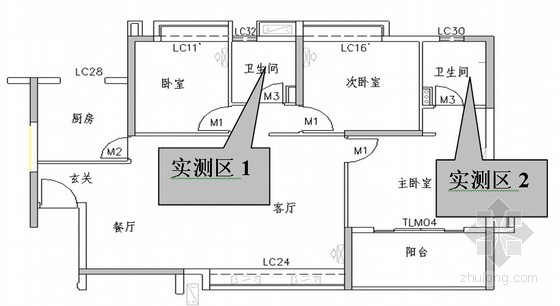 (1)实测区与合格率计算点:每1个卫生间为1个实测区,累计6个测区,不足6个时,需增加实测套房数。每个实测区取1个实测值。每个实测值作为1个计数点。