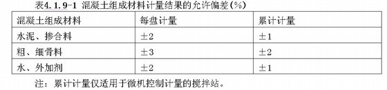 1拌制混凝土所用材料的品种、规格和用量,每工作班检查不应少于两次。每盘混凝土各组成材料计量结果的允许偏差应符合表4.1.9-1的规定。