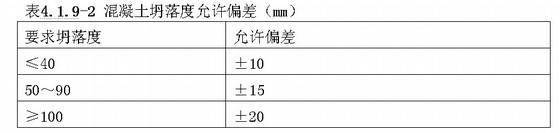 2混凝土在浇筑地点的坍落度,每工作班至少检查两次。混凝土的坍落度试验应符合现行国家标准《普通混凝土拌合物性能试验方法标准》GB/T50080的有关规定。混凝土坍落度允许偏差应符合4.1.9-2的规定。