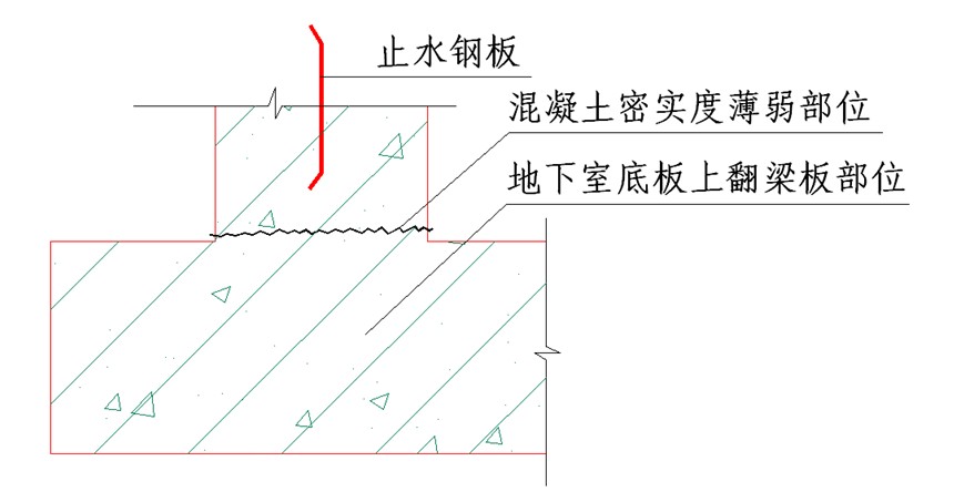 由于商品砼坍落度大,在进行地下室底板或顶板翻边部位施工时,振动棒振捣使砼流座到底板,施工人员往往少振或不振捣,导致砼不密实,因此形成渗漏薄弱点。